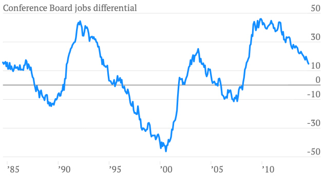 美國諮商會就業差值(conference board jobs differential)采自美國咨詢商會月度進行的對消費者的訪問,統計了認為“工作很難找”和認為“工作好找”人數之間的差值。這被認為是鑒別就業市場健康程度的指標之一。該指標已經穩步下降了數月之久,並在2月跌破20 ,這是2008年雷曼兄弟(lehman brothers)倒閉以來首次。而6月一度降至17.1,金融危機爆發以來的最低值,7月更是觸及危機后的新低14.8。這一個跡象表明就業非常強勁。(也就是說,事情並沒想象那么好。本質上美國人仍然感覺到找工作很困難,其難度和在2002年末和2003年初期間一樣,當時美國才開始擺脫2000年代初的經濟衰退后的失業型復甦。)[龍訊財經]