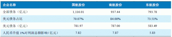 中債資信評估公司發布的報告稱,上半年航油價格同比基本持平,但人民幣兌美元匯率貶值,匯兌損失大幅拖累中國航空業業績表現。2014年以來,人民幣兌美元貶值約1%,國內航空航空公司因背負大量美元負債,財務費用對人民幣兌美元匯率和美元利息敏感度很高,特別是三大航美元負債占全部債務的比重超過70%,人民幣貶值對其帶來大量的匯兌損失。預計2014年上半年,全行業實現匯兌損益達-27億元,與去年同期的41億元相比大幅下降,拖累行業業績表現。