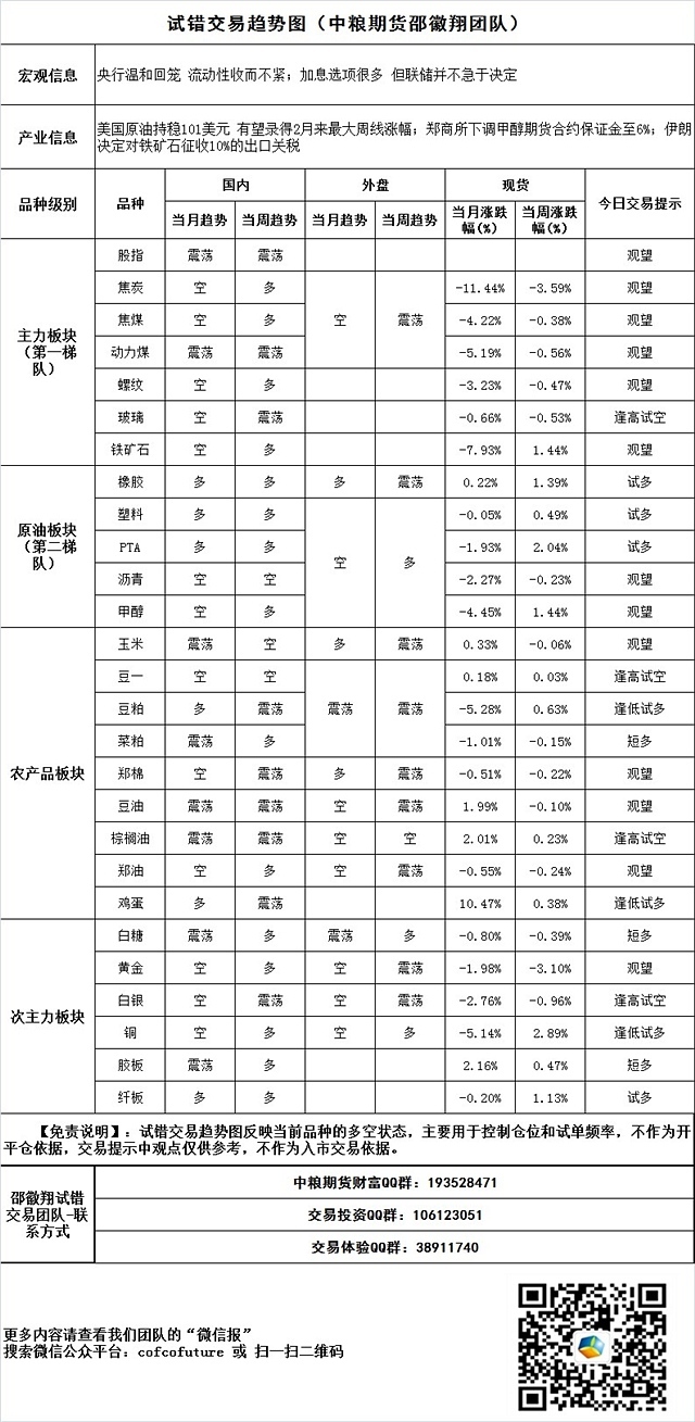 央行溫和回籠 流動性收而不緊;加息選項很多 但聯儲並不急於決定 美國原油持穩101美元 有望錄得2月來最大周線漲幅;鄭商所下調甲醇期貨合約保證金至6%;伊朗決定對鐵礦石征收10%的出口關稅 附:試錯交易趨勢圖(中糧期貨(博客,微博)邵徽翔團隊)