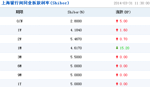 上海銀行間同業拆放利率(Shibor)顯示,短期利率方面,隔夜利率上漲5.00個基點至2.8000%;7天期利率上漲1.60個基點至4.1840%;14天期利率上漲0.70個基點至5.4670%;1個月期利率下跌15.20個基點至4.6170%。