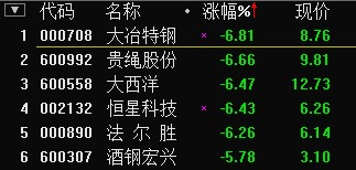 和訊股票訊 鋼鐵股早盤普跌,截至發稿板塊整體跌2.02%,大冶特鋼(000708,股吧)、貴繩股份(600992,股吧)、大西洋(600558,股吧)、恒星科技(002132,股吧)、法爾勝(000890,股吧)均跌超6%,酒鋼宏興(600307,股吧)跌超5%。